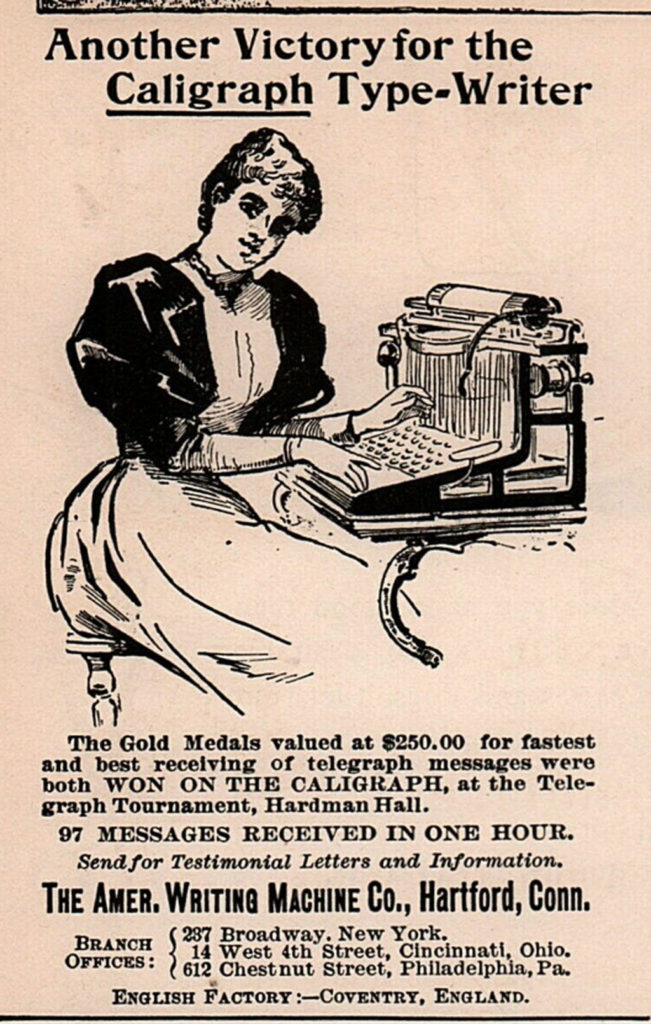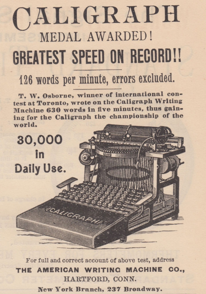 It might be hard to believe the following claim publicized in 1889. “GREATEST SPEED ON RECORD!! T. W. Osborne wrote 179 words in one single minute, and G. A. McBride wrote 129 words in a single minute, Blindfolded, on the Caligraph.”