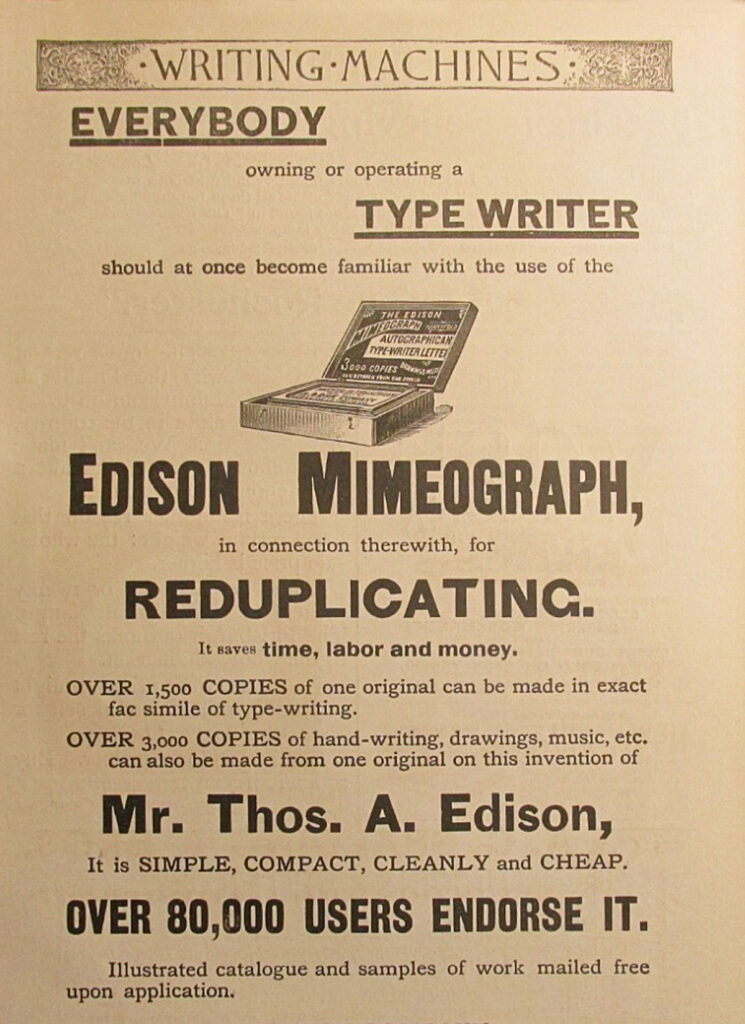 The resulting machine, the Edison Mimeograph Typewriter, was designed primarily to prepare stencils for Mimeograph duplication, although it was optimistically marketed as suitable for general typing as well. Once again, Edison’s name was applied to the machine for its considerable marketing value.