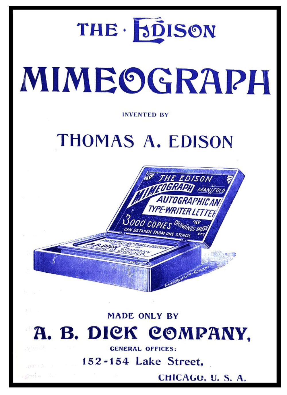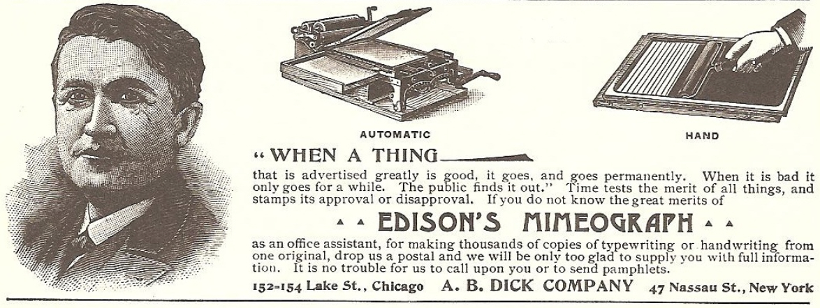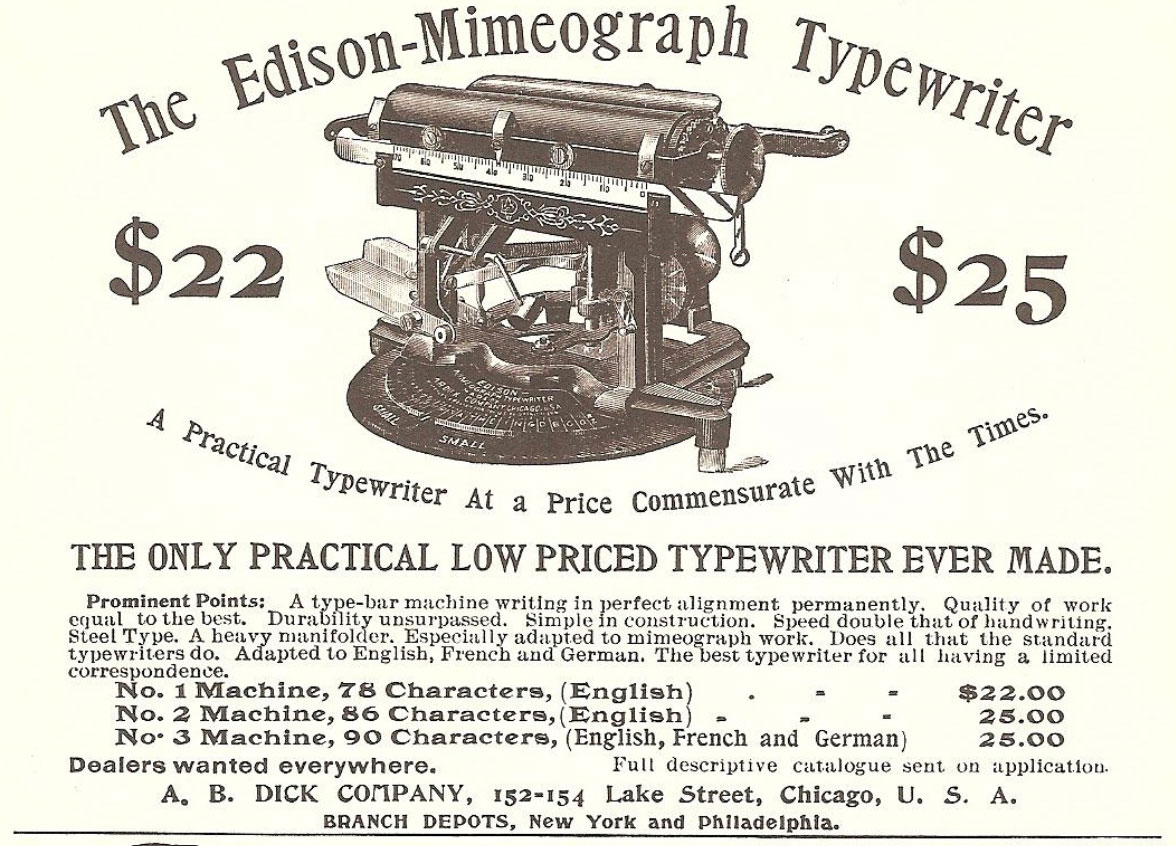 Despite its name, the Edison Mimeograph Typewriter was invented by Albert B. Dick and manufactured and sold by the A. B. Dick Company. To understand this attribution, one must look back to the developments that led to the invention of this intriguing and ultimately ill-fated typewriter.