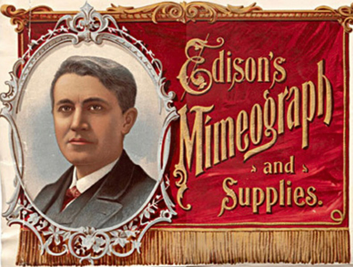 Dick licensed and refined Edison’s patents in 1877 and created the Mimeograph, from mimēma meaning something imitated and graph meaning to write. The following year he purchased a patent for a wax-coated stencil backed by porous tissue, that would not tear, for use on his Mimeograph.