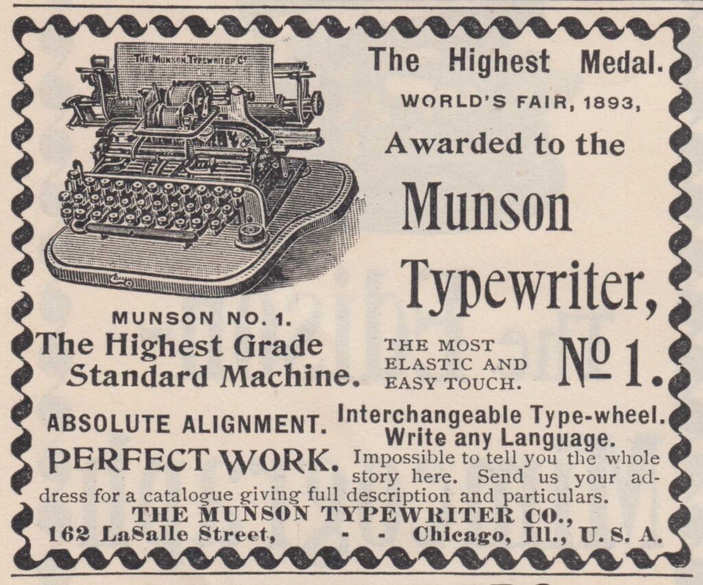Introduced in 1890, the Munson performed well in the market, though it is difficult to find today. In 1898, the design was acquired and rebranded as the Chicago when production was taken over by The Chicago Writing Machine Co. The Chicago typewriter, with some refinements, is essentially the Munson mechanism enclosed within a handsome cast iron cover.