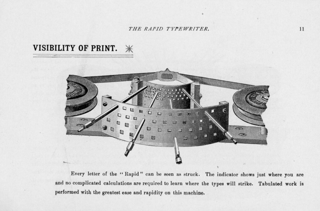 The Rapid was also innovative in being one of the first typewriters to incorporate a ribbon vibrator, making it the earliest machine to offer full front strike visible typing, a feature that would be firmly established by the Underwood 1 in 1896 and continue for the next century.