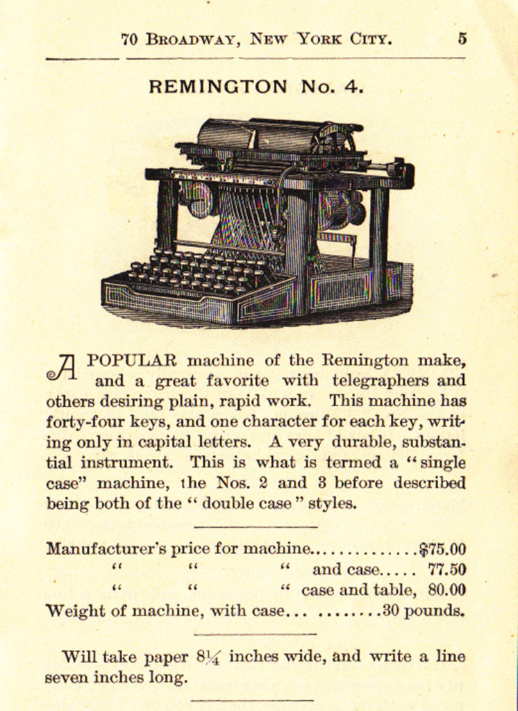 The Perfected 4 was used by telegraph operators, business houses for billing, and general correspondence. A period advertisement describes it as follows: “A popular machine of the Remington make, and a great favorite with telegraphers and others desiring plain, rapid work.”
